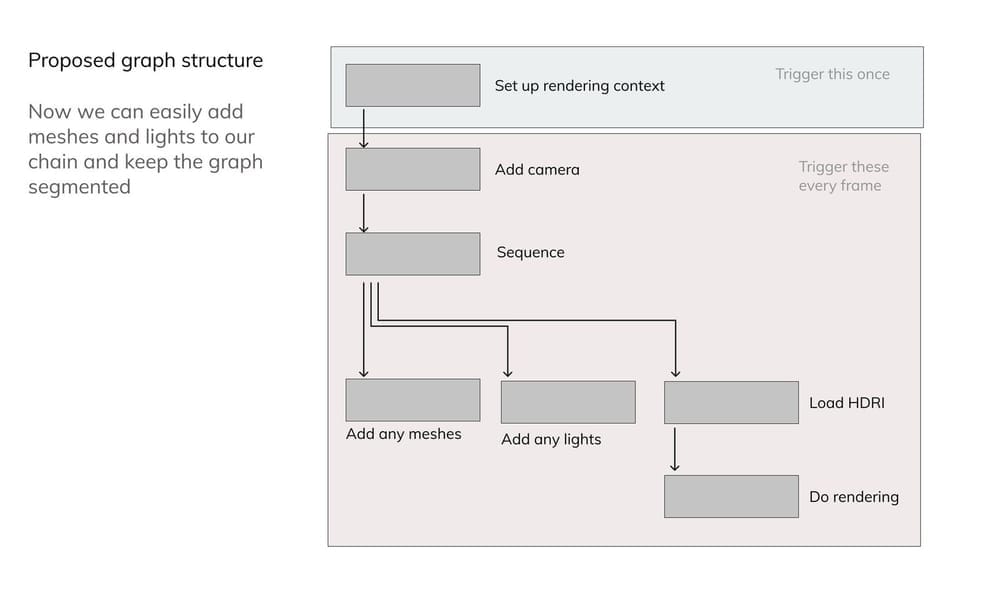 I also knew I wanted to have one node per scene 'entity', so one node representing one mesh or one node being one directional light etc. That leaves us with a graph looks something like this: