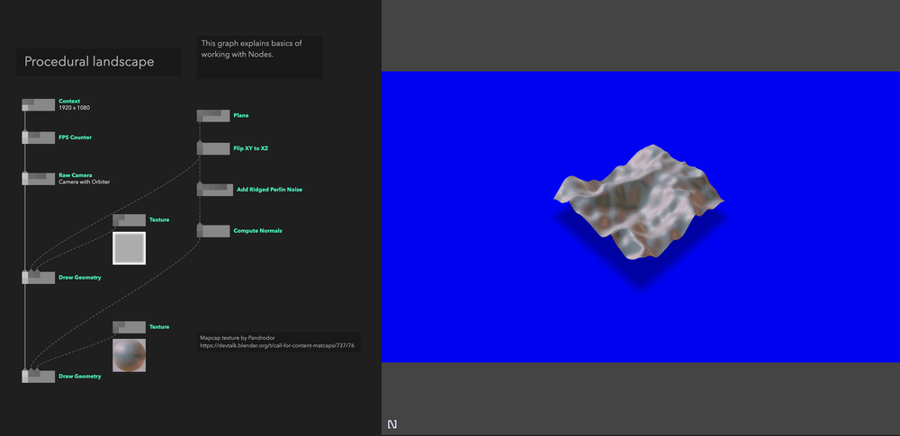 A benefit here is that one of the free examples provided with Nodes uses a similar structure to this. If we look at at the procedural landscape example it already set up the basics that we need: